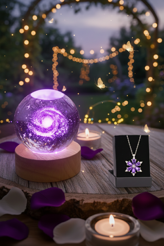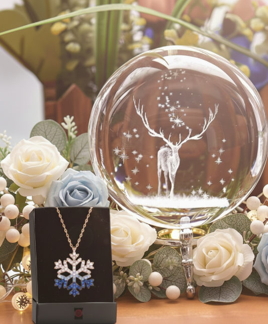 3D Galaksi Işıklı Cam Küre Gece Lambası & Kristal Taşlı Kar Tanesi Kolye Hediye Seti