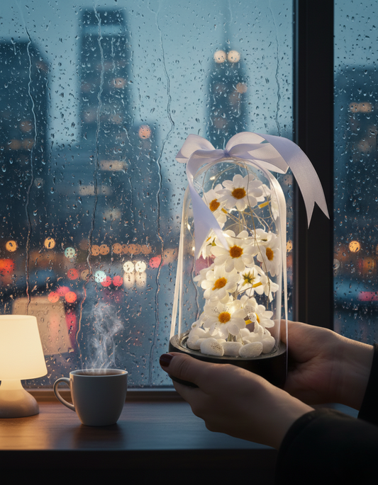 Işıklı Papatya Tasarımlı Cam Fanus - Gece Lambası