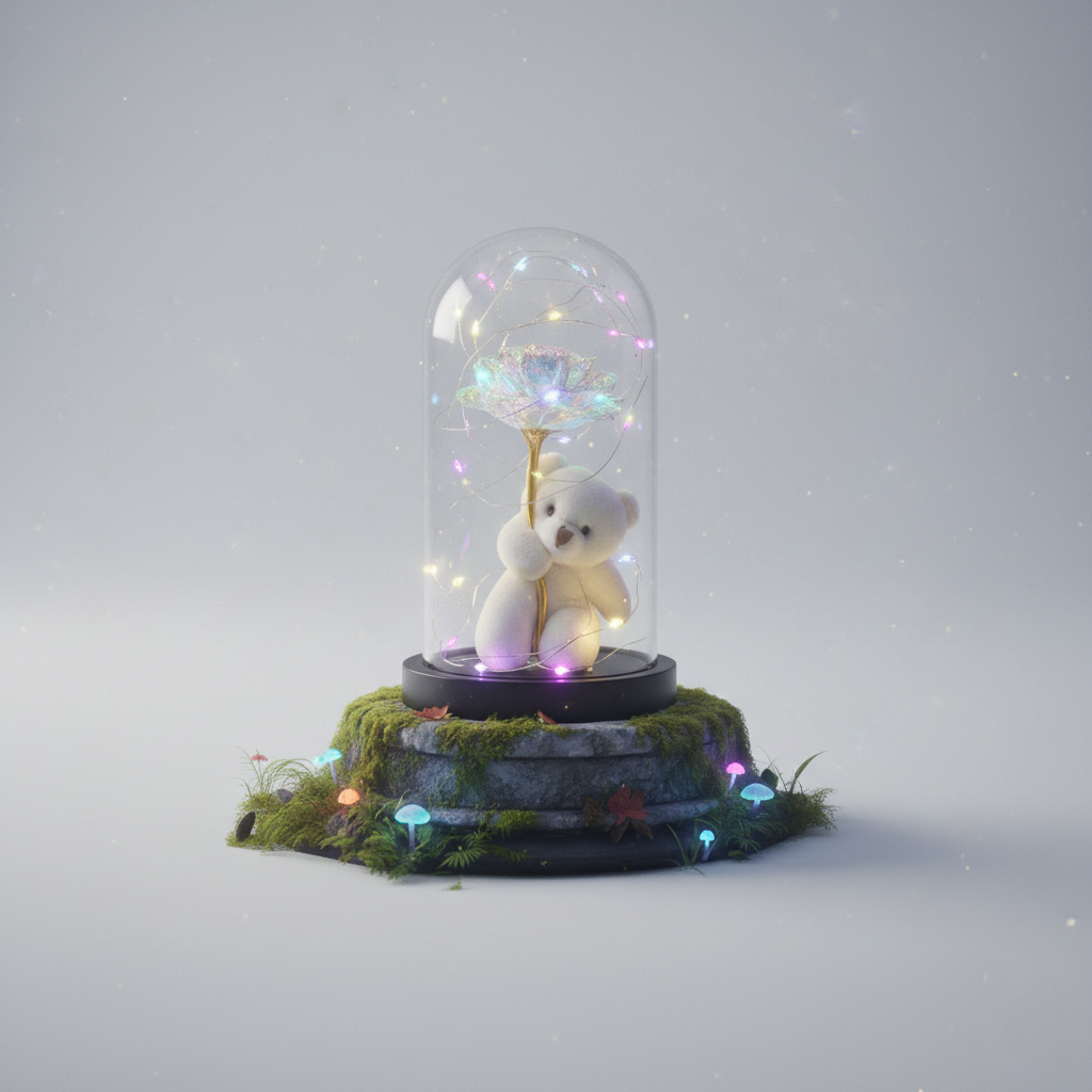 Sevginizi Işıltıyla Anlatın: Büyülü Hologram Gül ve Ayıcık Fanusu 🔮✨