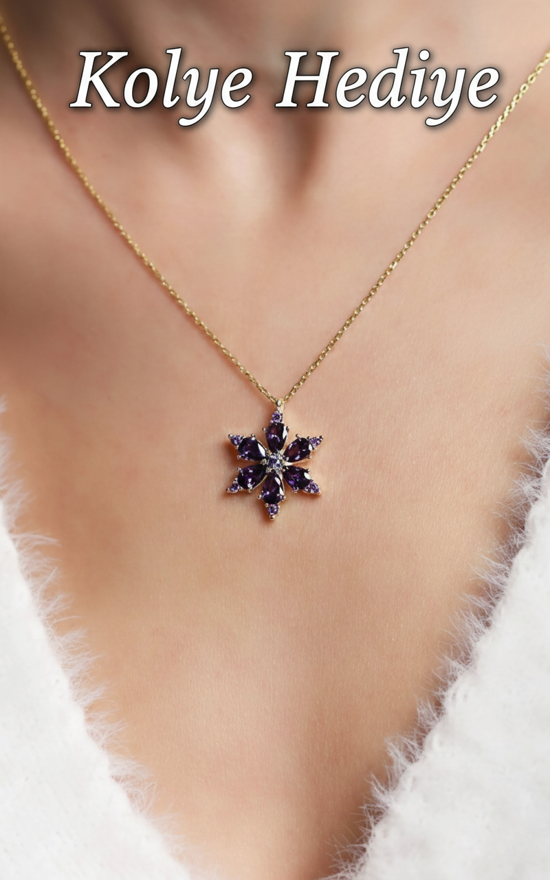 • Kristal Taşlı Kolye Hediye: Setin yanında gelen, mor kristal taşlarla detaylandırılmış zarif kar tanesi kolye, bu kombinasyonu eşsiz bir hediye seçeneği haline getirir.